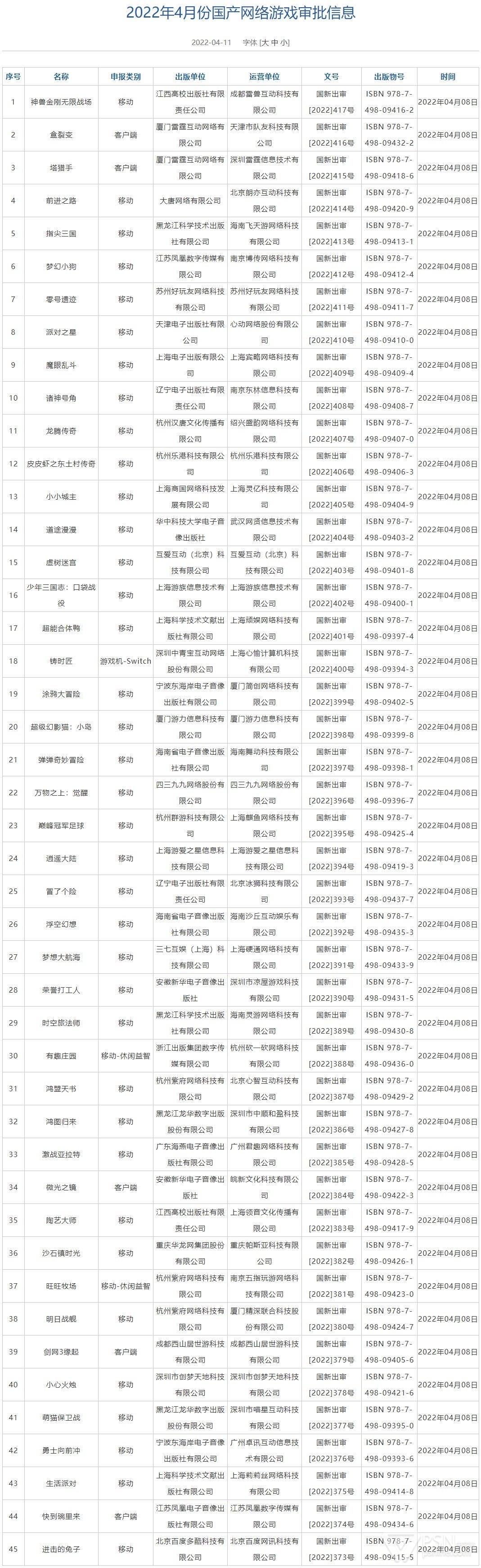 国家新闻出版署刚刚公布了“2022年4月份国产网络游戏审批信息”,客户端游戏西山居的3D武侠MMORPG《剑网3缘起》、重庆帕斯亚科技的《沙石镇时光》,手游《派对之星》、《梦想大航海》,Switch游戏《铸时匠》等45款游戏过审。