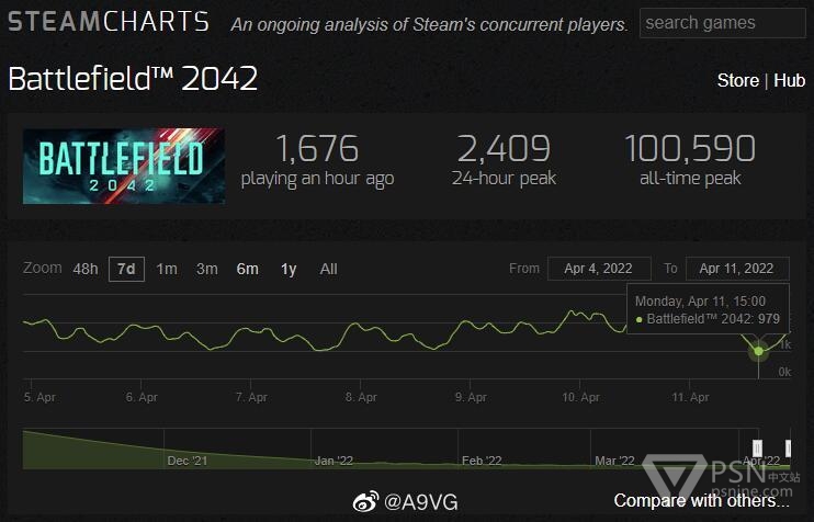 据SteamCharts网站显示,《战地2042》Steam版的同时在线玩家数今天已经跌倒了1000以下,最低时为979人同时游玩这款游戏。本作Steam版在过去一个月内的平均在线玩家数为1963人,而2018年发售的《战地5》在过去一个月内平均在线人数还有11588人。