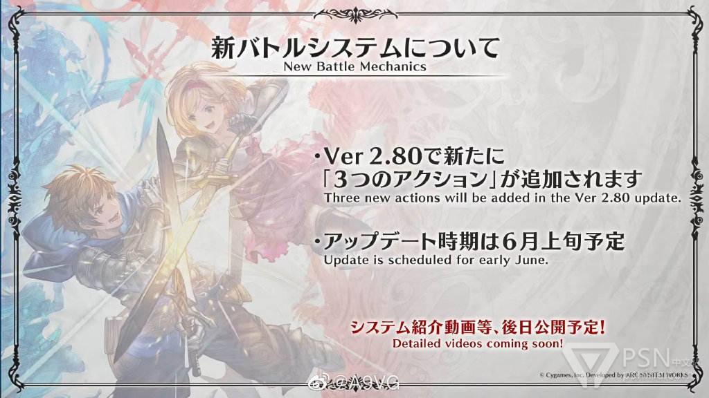 Cygames与亚克系统宣布,《碧蓝幻想Versus》将于2.80版本更新中丰富战斗机制,添加三种全新动作,该更新预计在6月上旬推出。另外官方还公布了“新参战角色投票”的调查结果,暗示未来将推出更多角色DLC,结果见配图。