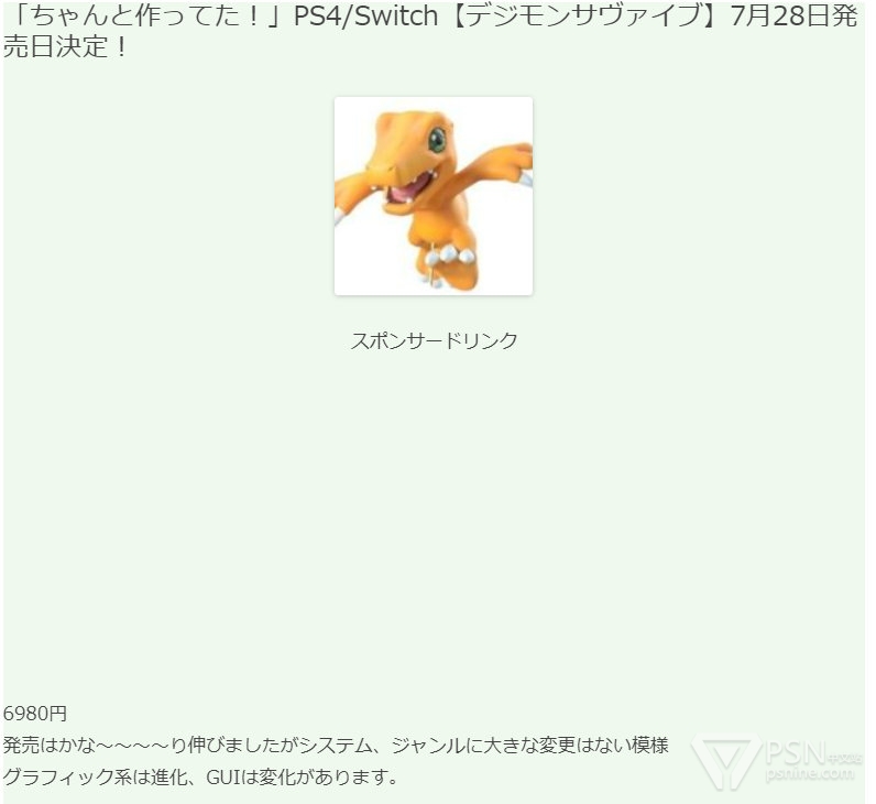 《数码宝贝:绝境求生》预计将于7月28日发售,发售 6980日元