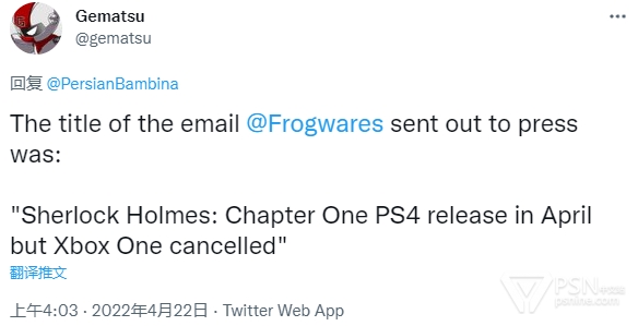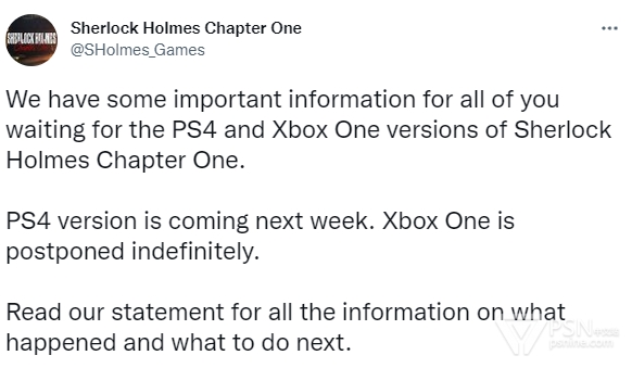 北京时间昨晚,《福尔摩斯:第一章》开发商Frogwares宣布:本作的PS4版将于2022年4月28日发售,Xbox One版因国际局势被无限期推迟。官方表示他们知道有很多玩家在等待Xbox One版的推出,他们也希望能把自己的游戏带到更多平台上。已预购了Xbox One版的玩家可以获得全额退款。