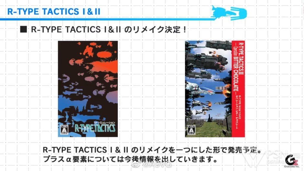 开发商Granzella宣布将制作《R-Type 战略版》《R-Type 战略版2:苦巧克力行动》两作的重制版,以合集形式推出,发售日期、登陆平台等更多情报暂未透露。原作由开发商Irem制作,分别于2007与2009年登陆PSP平台,类型由《R-Type》系列一贯的横版飞行射击改为战略模拟类型。