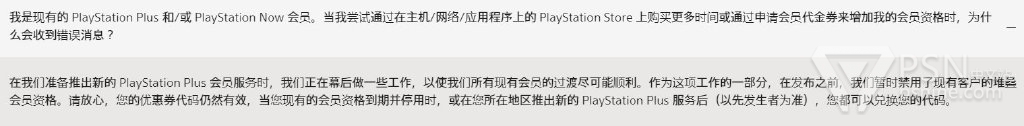【预付卡暂时失效】索尼今天更新了PlayStation Plus的Q&A信息,其中提到在新会员上线之前,已经暂时禁用了现有订阅者通过预付卡来堆叠会员资格,以保证新老会员顺利过度。预付卡依旧有效,在现有会员到期,或者所属地区新会员上线后即可使用。