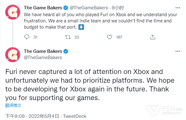 「Onnamusha」不会登陆Xbox,对此The Game Bakers表示:“我们听到了Xbox玩家的呼声,也理解你们的沮丧。但我们是一个很小的独立团队,我们没有时间和预算来开发Xbox版。《Furi》在Xbox上没有引起过太多关注,很遗憾我们得优先考虑其它平台。我们希望未来能再次为Xbox开发游戏,感谢大家对我们游戏的支持。”