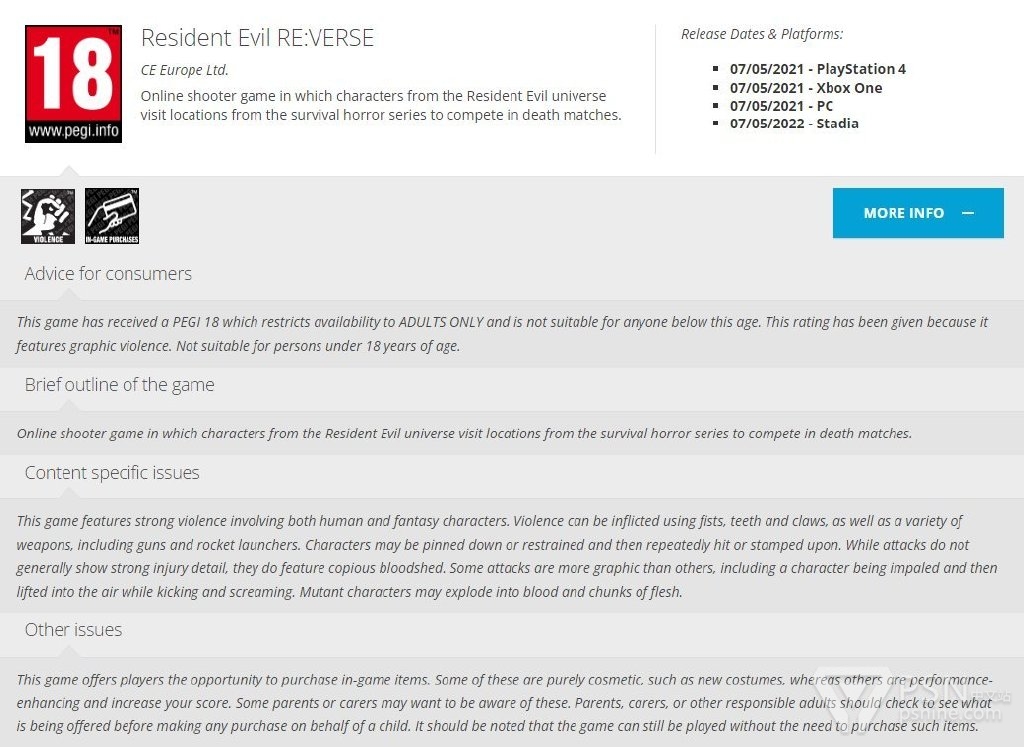 《生化危机 Re:Verse》Stadia云游戏版今日在欧洲游戏评级网站PEGI过审,PS4/Xbox One/PC版本于一年前同天通过审核,或许近期会有新的相关消息公布。