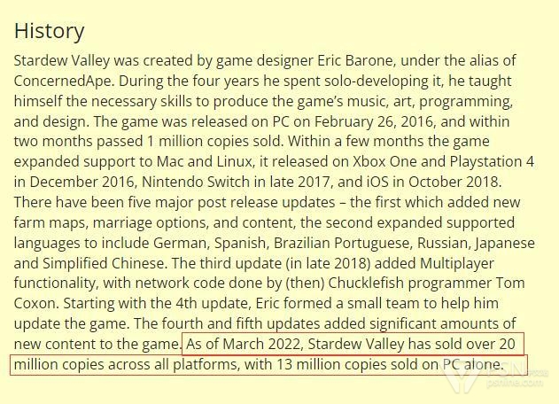 《星露谷物语》官方网站显示,截至2022年3月本作全平台销量已经超过2000万份,其中PC版销量1300万份。