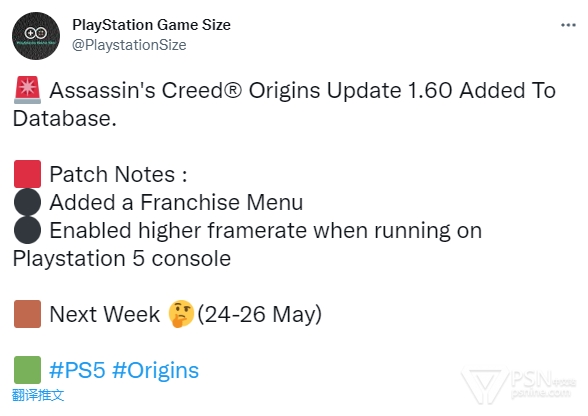 《刺客信条:起源》1.60版本已上传至PSN后台,预计将于下周(5月24日-5月26日)正式推出。1.60版本将使游戏在PS5上拥有更高的帧数。