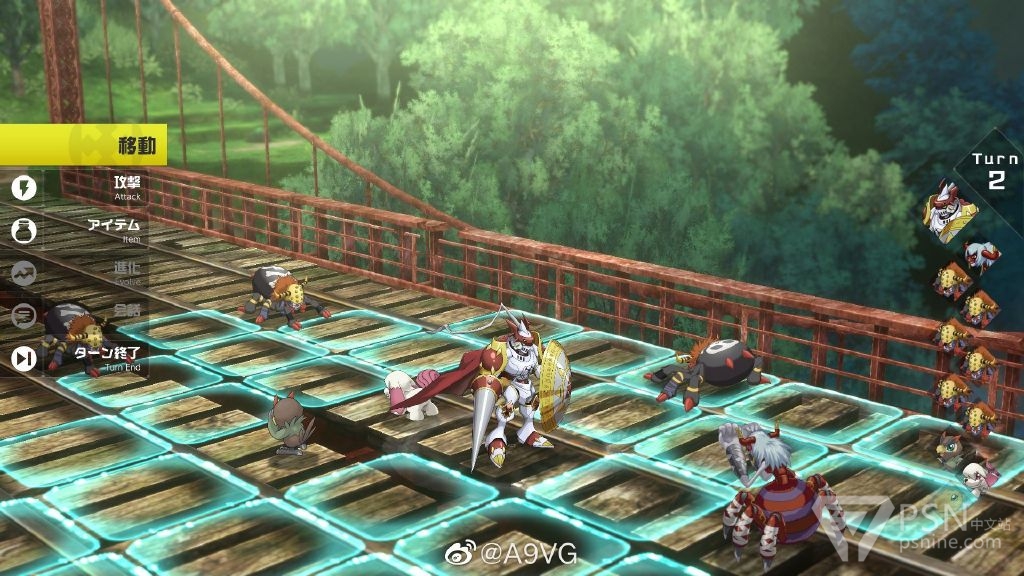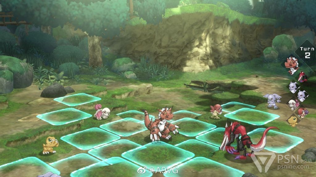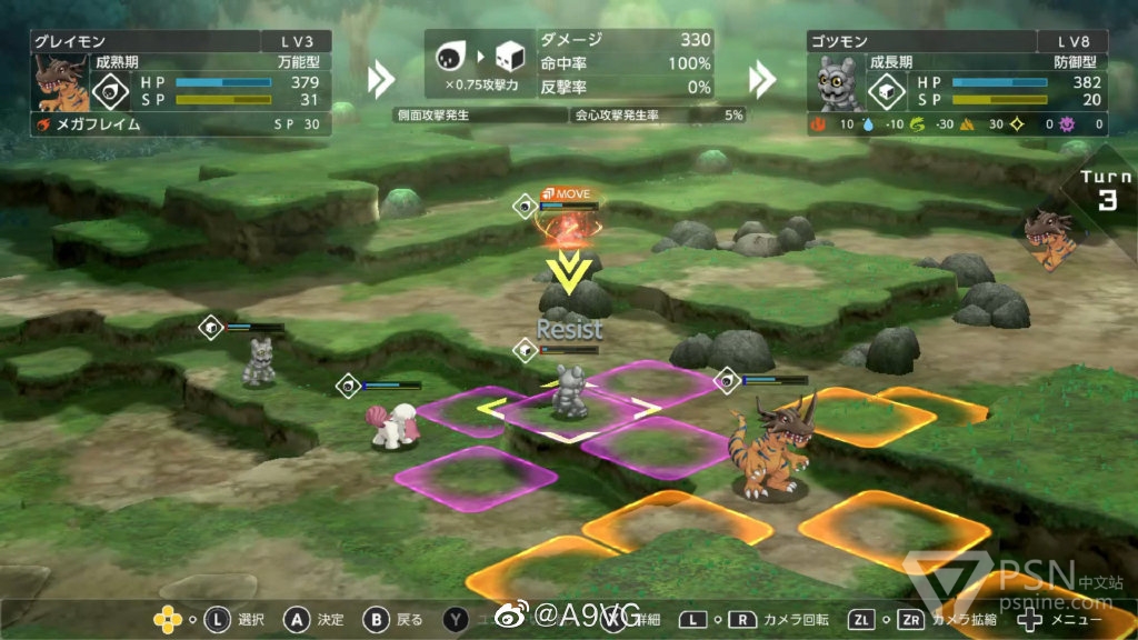 战斗部分,玩家通过发动数码宝贝们的“进化”与“招式”展开集团战略战,开始时最多可选择10只数码宝贝参战,根据它们的敏捷值来决定行动顺序,每只数码宝贝的移动距离、高低差攀登力不同,每种招式的攻击范围与射程距离也各异,依旧存在种族(资料·疫苗·病毒)与攻击属性间的相克要素。