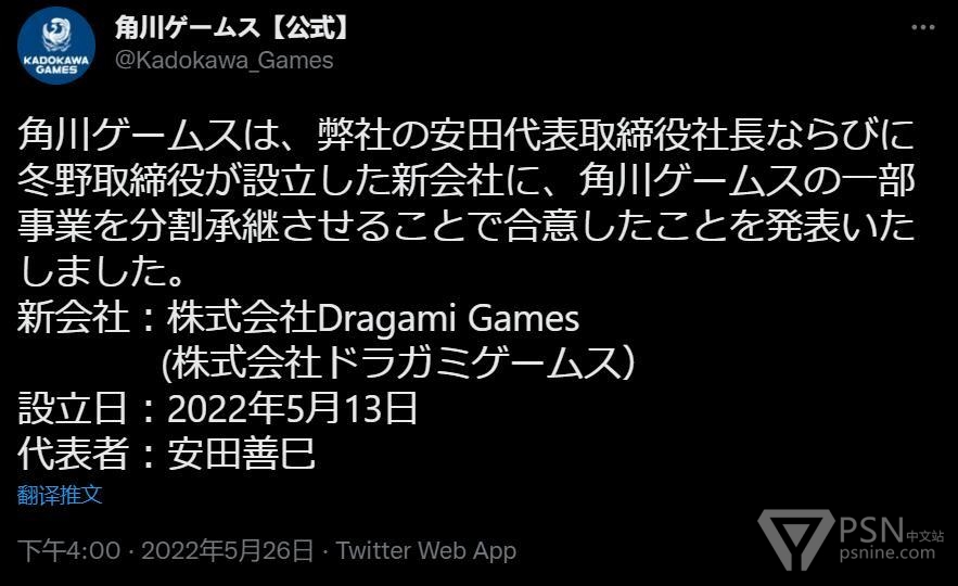 角川游戏今日宣布,将通过公司拆分将部分业务转让给由角川游戏原代表取缔役社长「安田善巳」及取缔役「冬野智」独立成立的新公司所接管,新公司名为「Dragami Games」。由新公司继承的游戏作品包括《神之战》《方根胶卷》《方根书简》《LoveR》《传继者》等(图3)。