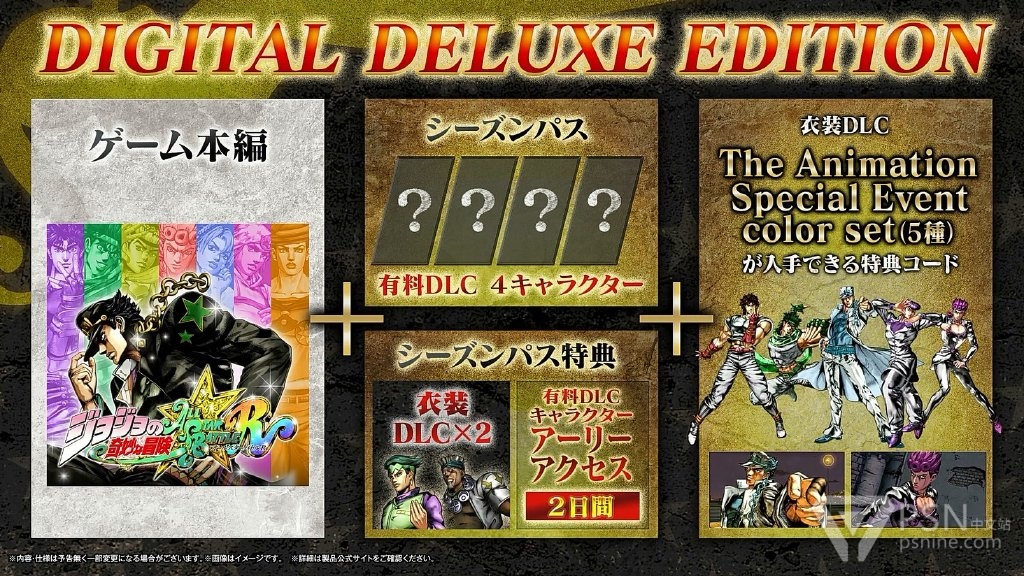 · 数字豪华版包括游戏本体、季票与季票特典、前五部JoJo(GioGio)的“动画特别活动配色套装”外观
