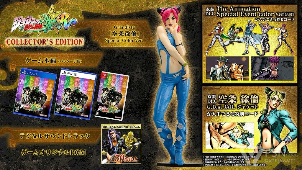 · 实体收藏版将包含PS5/PS4/Switch版实体游戏,数字豪华版的全部特典、空条徐伦手办、数字音乐原声集(收录50首以上曲目)
