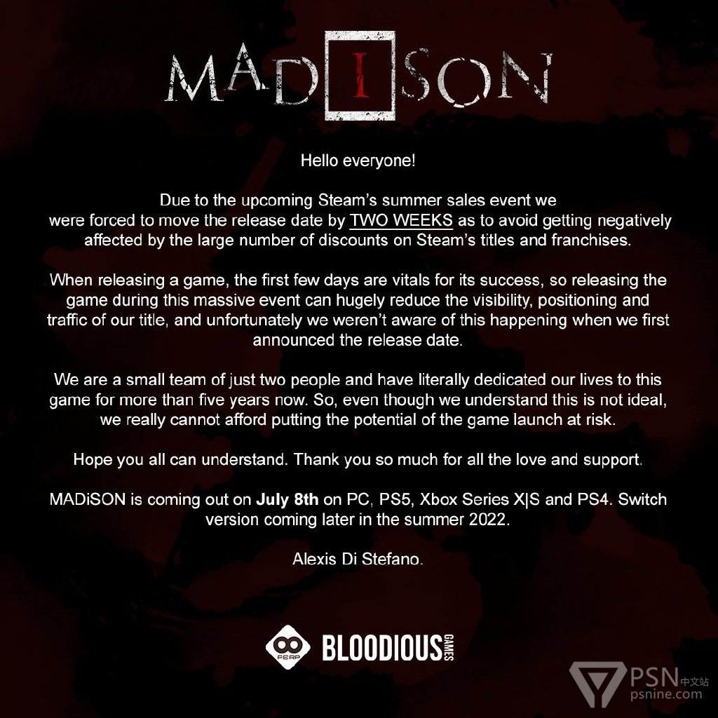 原定于6月24日发售的心理恐怖游戏《失心疯(MADiSON)》宣布延期至7月8日发售,游戏将登陆PS5、PS4、Xbox Series X|S、Xbox One、Switch、PC平台,支持中文。