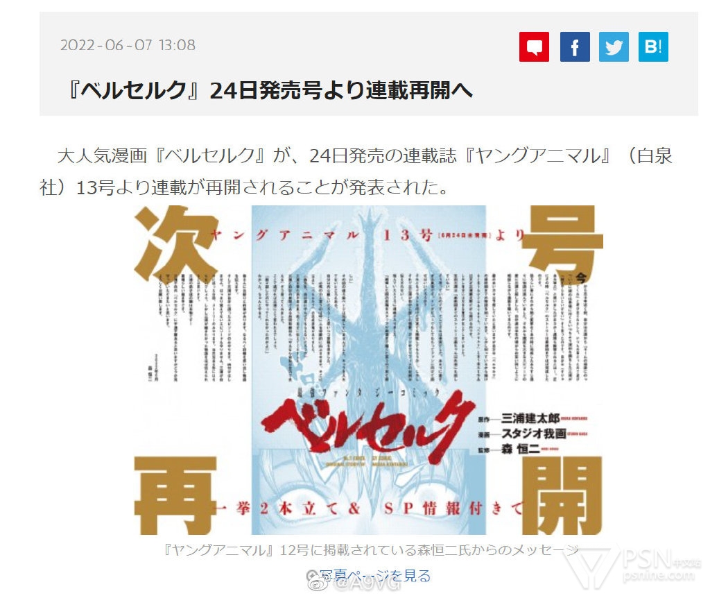 《剑风传奇》将从本月24日发售的《ヤングアニマル》(白泉社)13号起重开连载,三浦建太郎原作,スタジオ我画作画,森恒二监修。