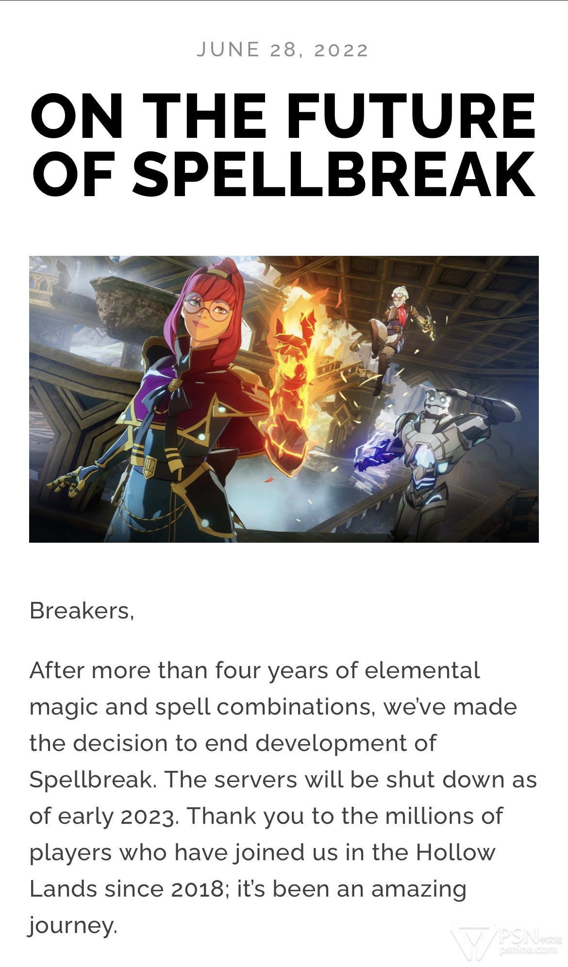 关服预告:免费魔法吃鸡游戏Spellbreak官网发布了游戏未来的计划,服务器预计在2023 年早些时候关闭。