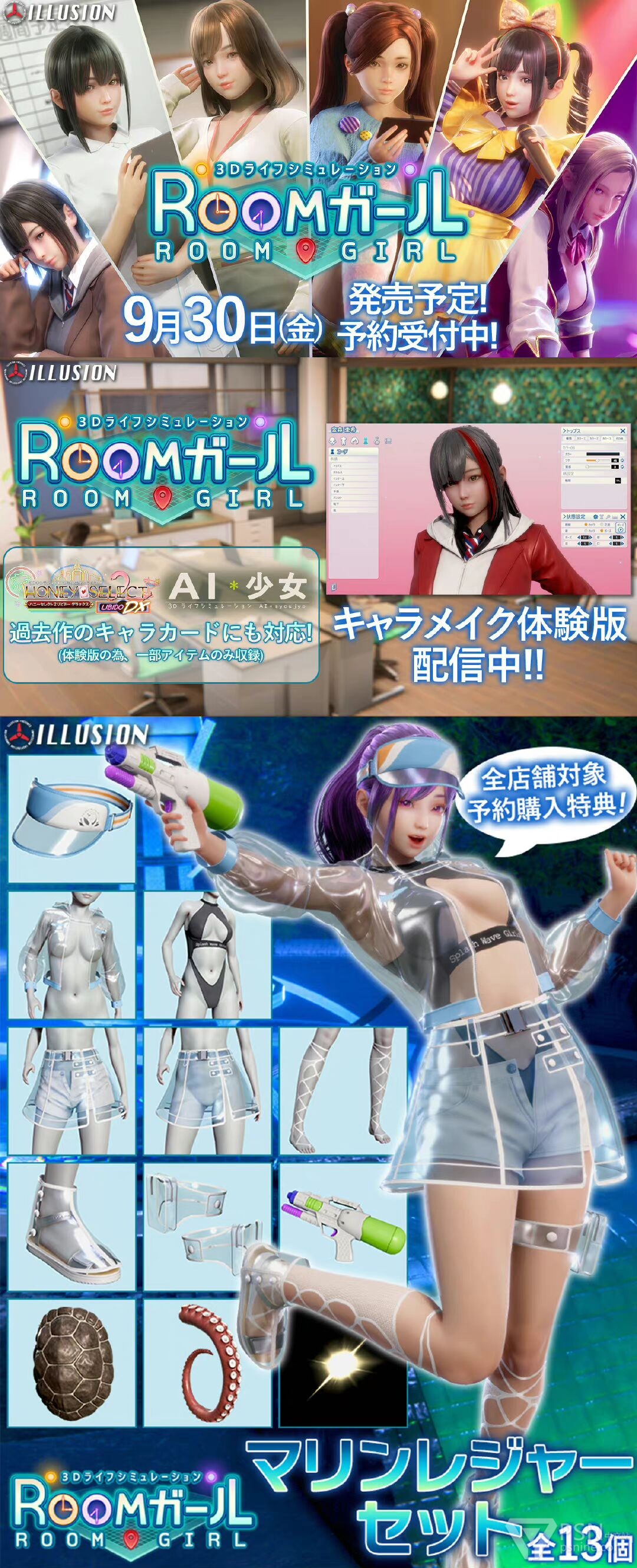 【我什么都不知道,别问我】ILLUSION最新作《ROOM GIRL》官网上线,游戏预定于9月30日发售,捏人体验版现已发布,预购奖励包含限量版服装“海洋休闲套装”。