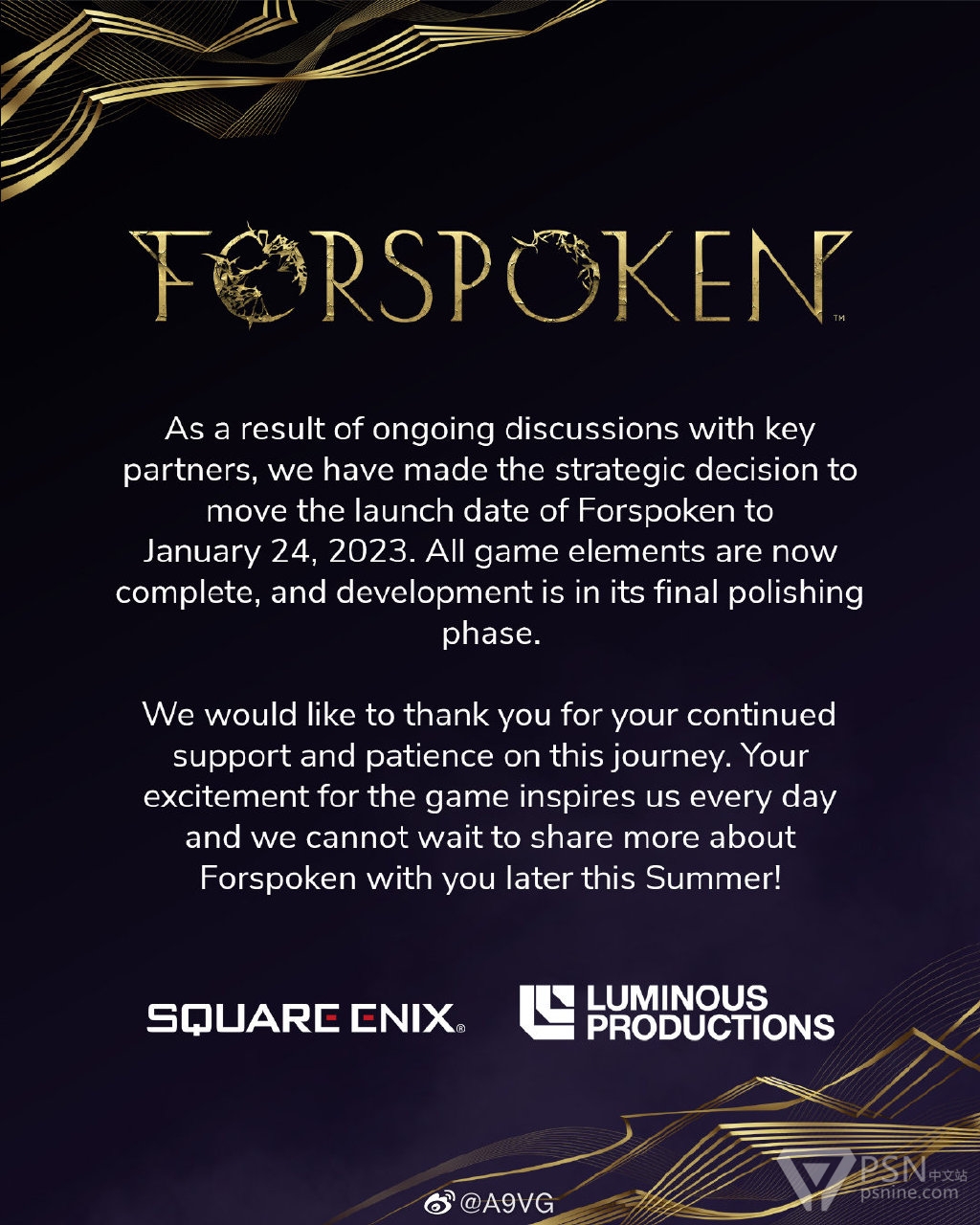 SE夜光组ARPG《Forspoken》再次延期至2023年1月24日发售,本作将登陆PS5与PC平台,支持中文。官方表示延期原因是与“关键合作伙伴”协商后的结果,游戏开发已经完成,现在处于最后打磨阶段,更多关于这款游戏的消息将于今年夏季晚些时候公开。