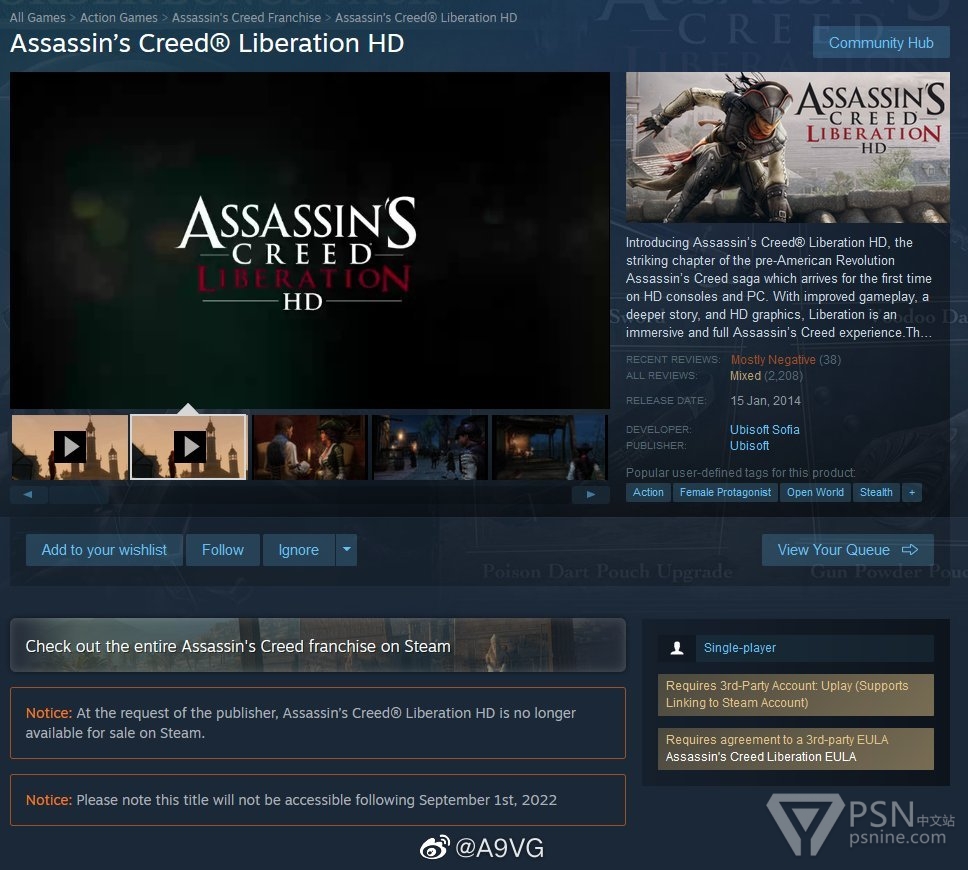 育碧游戏《刺客信条3 解放 HD》与《沉默猎人5 大西洋之战》Steam页面透露两款游戏将于9月1日下架,现已无法购买,但玩家发现还有一条“本作在2022年9月1日后将无法启动”的提示,似乎表示玩家即便花钱购入了Steam版本,在9月也无法继续游玩。