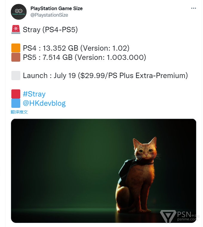 根据国外玩家PSGS透露,猫咪冒险游戏《迷失 | Stray》PS5版容量约为7.514 GB,PS4版容量约 13.352 GB。下载版已包含修复各种运行问题的首日补丁,7月19日登陆PS5/PS4/PC,首日加入PS+二/三档,不过似乎不支持提前预载。