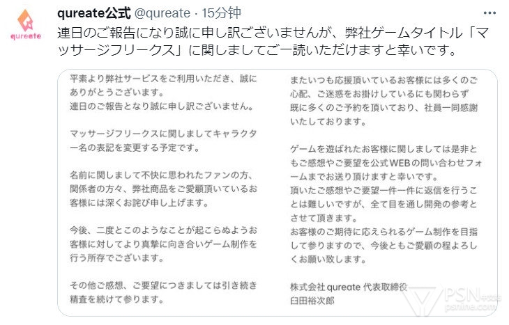 qureate于上周公布的NS平台按摩音游《按摩狂》被网友发现其中登场角色的名字全都跟偶像团体日向坂46的成员一样,而游戏的制作人也被人发现关注了很多日向坂46相关的账号,是个日向坂46的粉丝。由于这个游戏是个尺度比较大的“绅士游戏”,因此qureate及制作人被日本网友群起而攻之。qureate刚刚发表公告称对角色名字给大家带来的不快表示道歉,之后会对角色的名字进行修改。