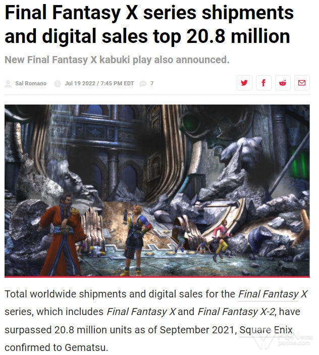 SE向外媒Gematsu确认,截止到2021年9月,包含《最终幻想10》和《最终幻想10-2》在内的《最终幻想10》系列累计系列销量突破2080万套。