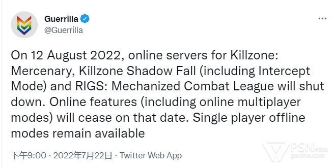 【《杀戮地带:雇佣兵&暗影坠落》服务器将于8月12号关闭】《杀戮地带》系列开发商Guerrilla昨日在推特宣布,《杀戮地带:雇佣兵》《杀戮地带:暗影坠落》《RIGS:机械化战斗联盟》三款游戏的在线服务器将于8月12号关闭,在线功能(包括在线多人模式)将在那一天停止,单机离线模式仍然可用。