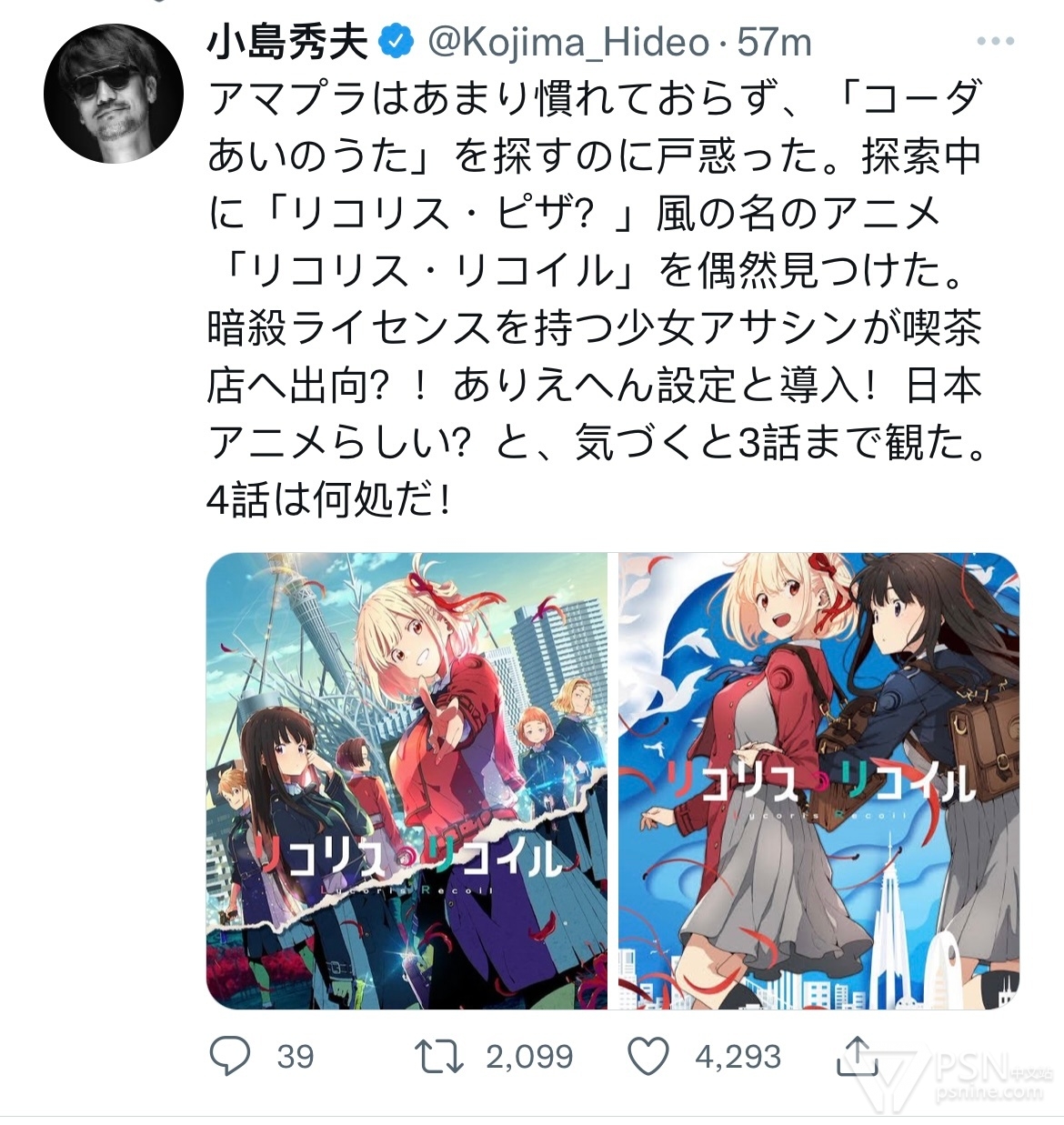 小岛秀夫说他在Amazon Prime上搜索时偶然的找到了一部名叫「Lycoris Recoil」的动画、一不留神三集一口气看完了、才发现怎么没了、于是发推问“第四集在哪!”