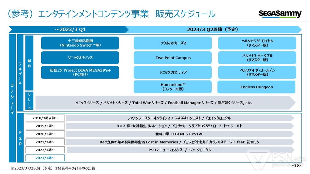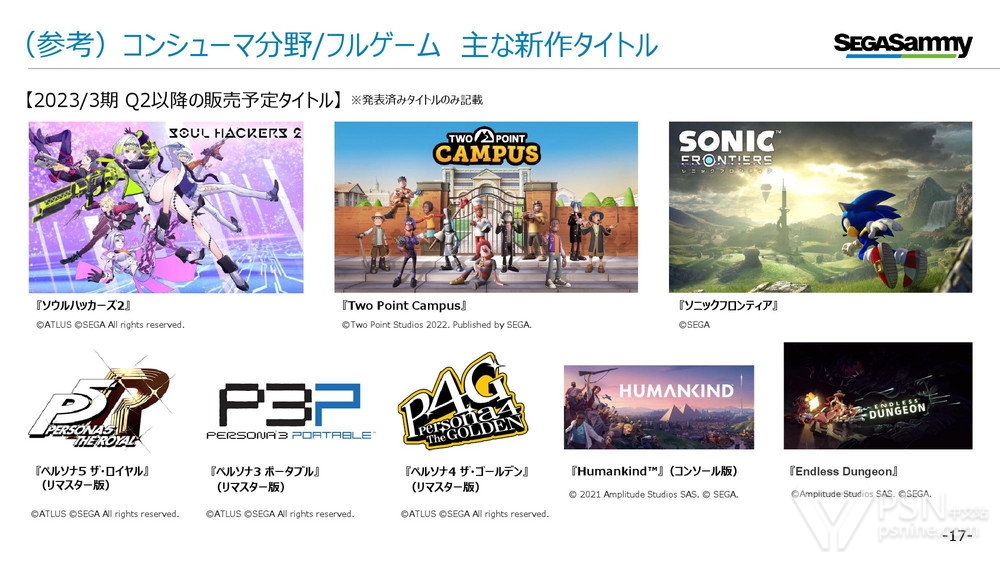 世嘉计划在Q2之后正式向市场投入主打作品,未来将有《索尼克 未知边境》《灵魂骇客2》《女神异闻录》系列移植版等多款新作推出。
