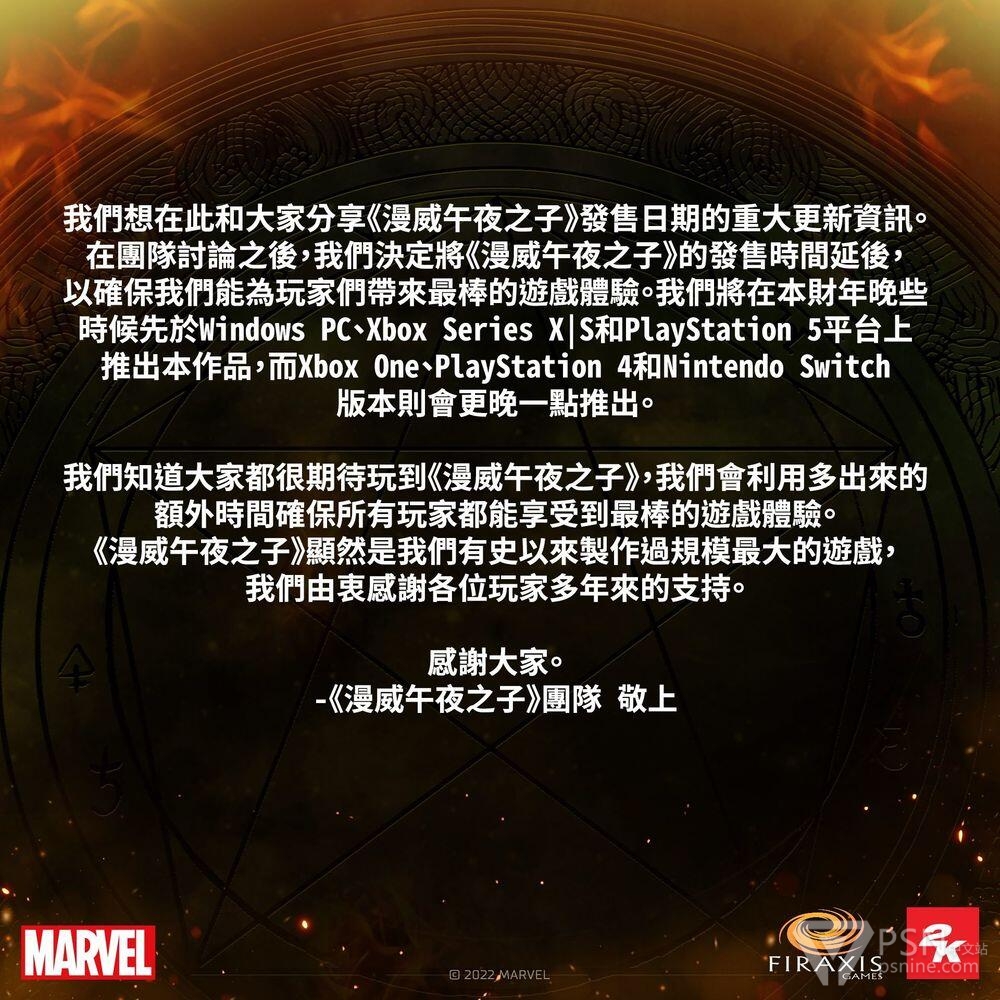 2K宣布策略游戏《漫威暗夜之子》将延期推出。本作原定于今年10月7日发售,目前预计在本财年(2023年4月前)稍晚时上市,登陆PS5、PS4、Xbox Series、Xbox One、NS、PC平台。玩家在游戏中将扮演原创英雄“猎人”,率领复仇者联盟、X战警等系列的英雄对抗被九头蛇复活的恶魔之母莉莉丝。