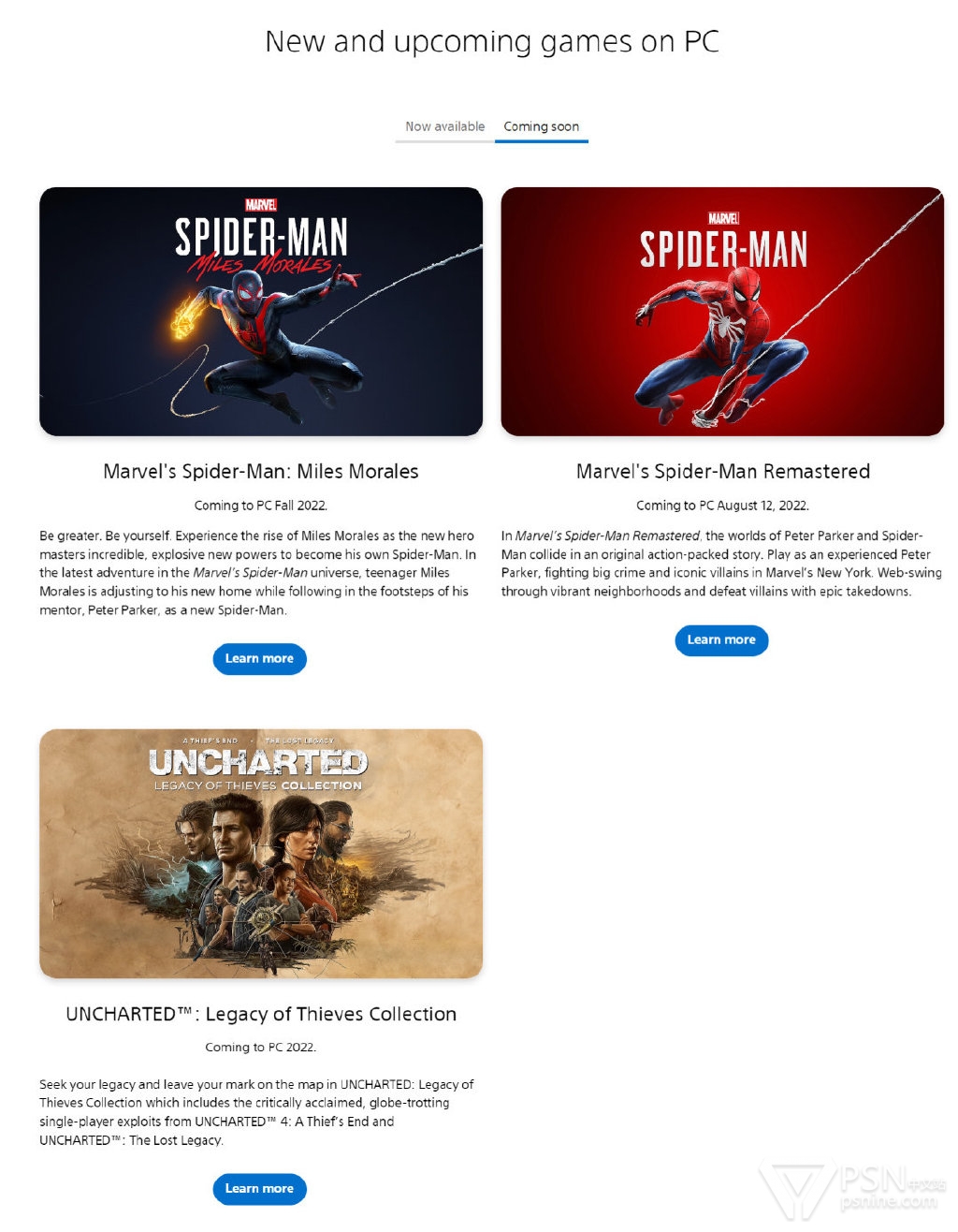 索尼官方公开已经和即将登陆PC平台的PlayStation游戏介绍页面,根据页面显示,《漫威蜘蛛侠 迈尔斯莫里莱斯》将于今年秋季登陆PC平台,《神秘海域:盗贼传奇合集》将于年内登陆PC平台。