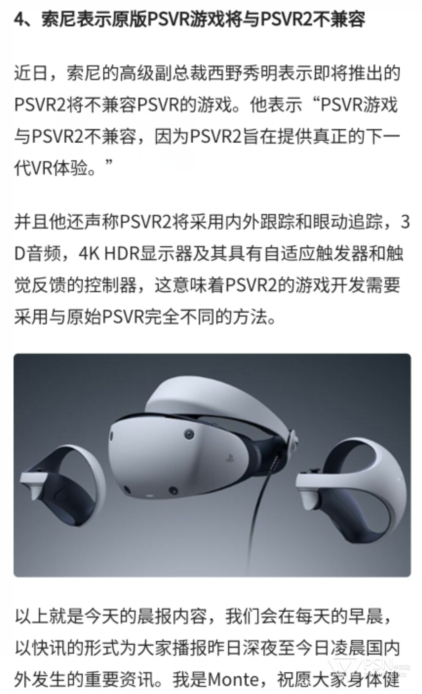 官方:上述消息公开不久后,在PS VR2规格正式公开就将其爆料出来的消息人士PSVR without Parole透露“众多开发者正在制作他们PSVR游戏的PSVR2版本”,而且他在2021年8月的爆料中也有提到“PSVR游戏高清化的企划”。不过目前只能等待官方来公布具体细节,初代PSVR游戏是否支持升级至PSVR2版本等问题也需要得到解答。