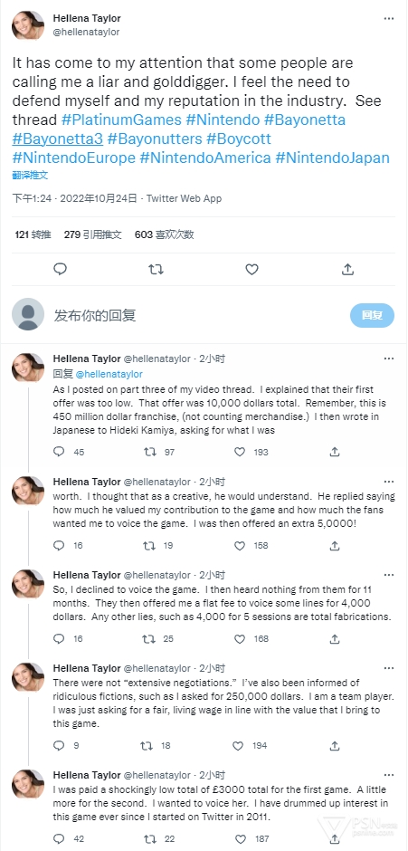 Hellena Taylor承认白金工作室给出的报价是1万美元(并非4000美元),但她觉得这个价格对于一个价值4.5亿美元的IP太低,于是用日语和神谷英树进行了沟通,并觉得神谷英树可以理解她。神谷英树在之后也回复说团队非常重视她的贡献,也听到了游戏粉丝希望她能够继续给贝姐配音,于是给她加了50000美元(彭博社此前报道最终报酬是1万5美元,此处可能是她的笔误,原本想写5000,但也可能白金真的报了6万刀)。