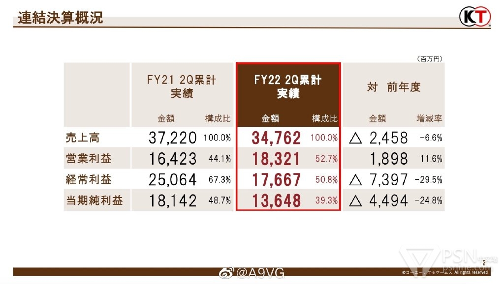 上半财年有多款新作面市,包括:「ω-Force」品牌于6月推出了《火焰纹章无双 风花雪月》,「涩泽光」品牌于7月日本国内及亚洲其他地区发售了《信长之野望 新生》,「Team NINJA」品牌则在9月发布了新作《卧龙 苍天陨落》的体验版,该作预定于2023年3月上市,几款新作的表现均良好。此外「GUST」品牌下的《莱莎的炼金工坊》系列也继续保持热销。手游方面,自社开发作品与授权作品也依旧以良好状态稳定运营,整体发展趋势平稳。