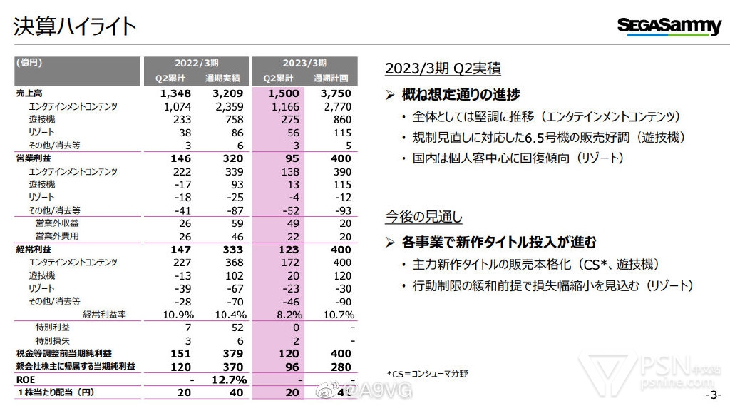 其中以家用游戏为中心的娱乐内容业务方面,上半财年主要发售的新作包括《灵魂骇客2》《双点校园》等,新作销量稍稍不及预期目标。上半财年家用游戏整体销量为1014万份,相较于上一财年同期的1404万份明显有所下滑。反而以《世界计划彩色舞台feat. 初音未来》为中心的F2P作品表现优秀,加上汇率影响,销售额得以增长。