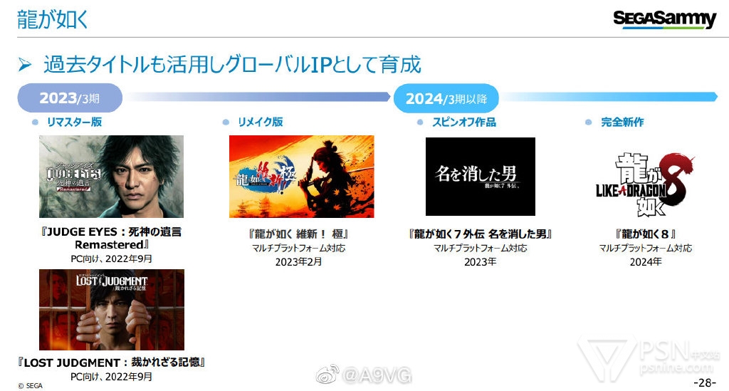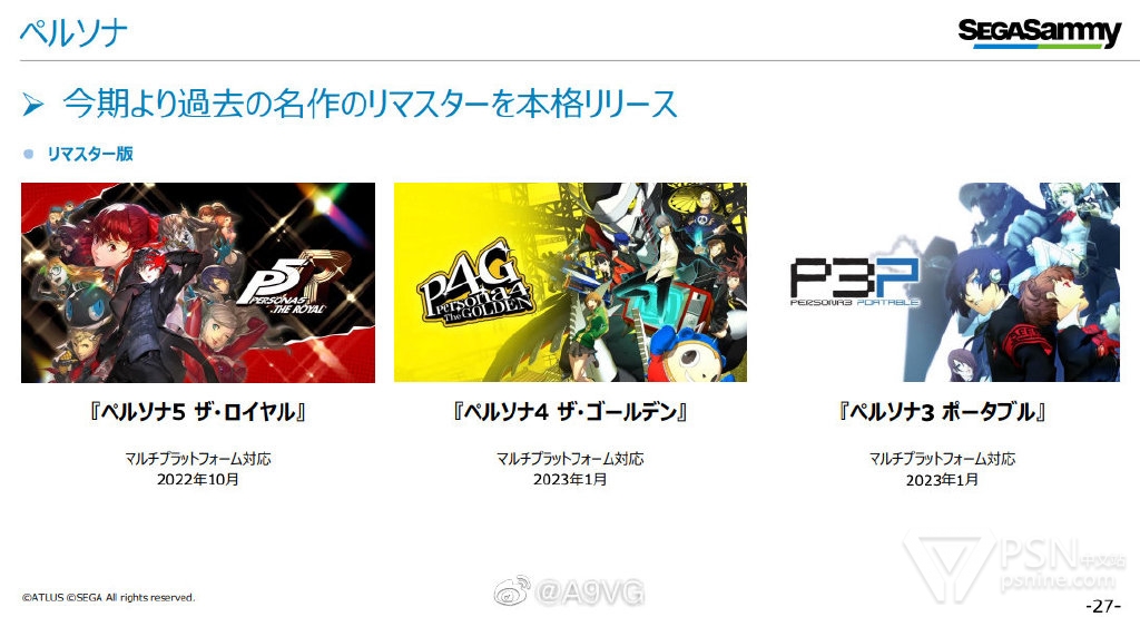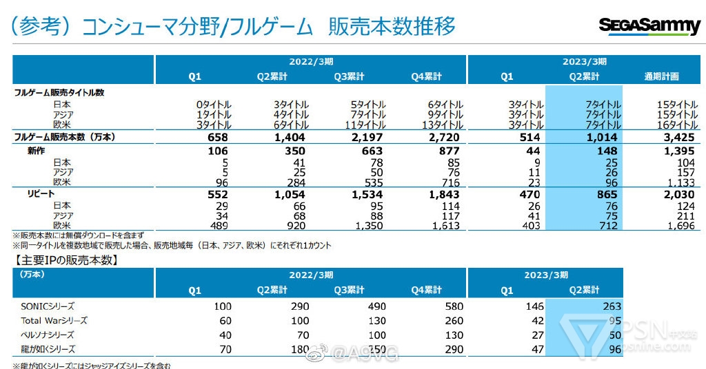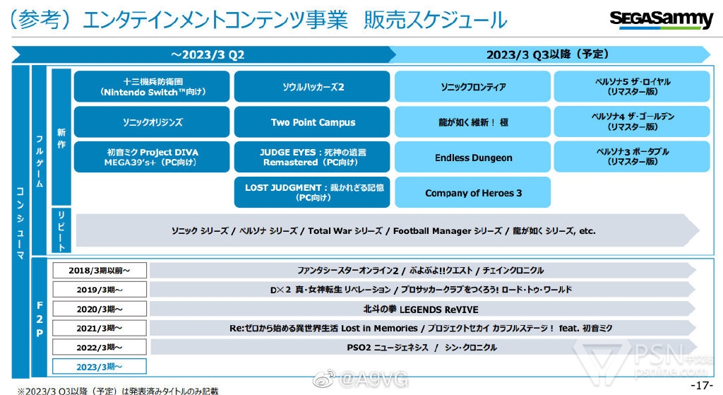 世嘉预计在22-23财年Q3 之后正式向市场投入多款大型新作,除了《索尼克 未知边境》外,还有《女神异闻录》系列三款旧作的复刻移植版,以及《如龙 维新!极》等。F2P方面,在继续致力于加强现有作品运营的同时,还计划发布一款新游戏。