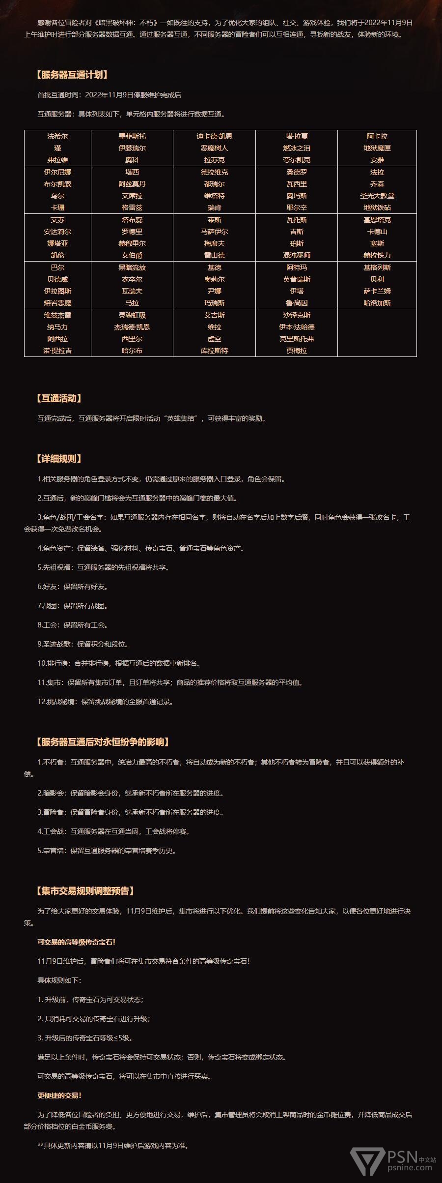 《暗黑破坏神:不朽》部分服务器将从2022年11月9日起互通,详情见下方图片