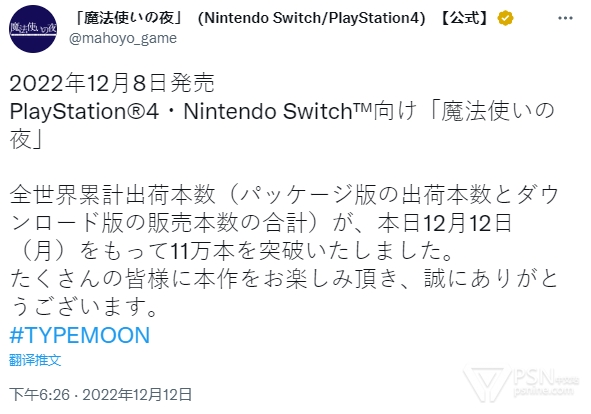 PS4/Switch版《魔法使之夜》出货量已突破11万份,本作于2022年12月8日发售。