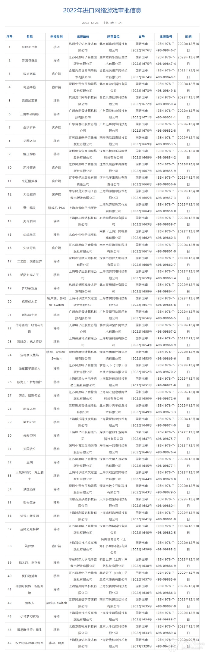 国家新闻出版署发布12月进口网络游戏审批信息,共计45款游戏过审,包含《宝可梦大集结(移动+NS)》《壁中精灵(PS4)》《双点医院》《筑梦颂》《第七史诗》《仙剑奇侠传:新的开始》《面条人(NS)》《二之国 交错世界》《疯狂伐木工》等。
