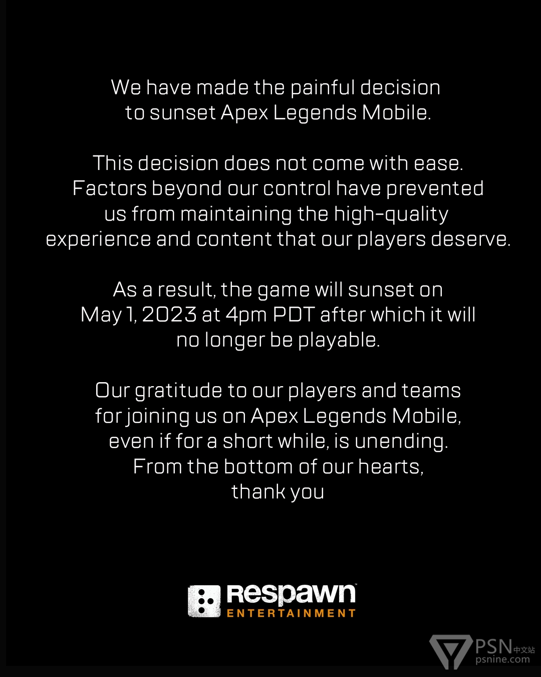 《Apex英雄手游》将于北京时间2023年5月2日8:00关服。目前游戏已下架,游戏的氪金项已停止销售。玩家此前在游戏中的消费不会被退款。