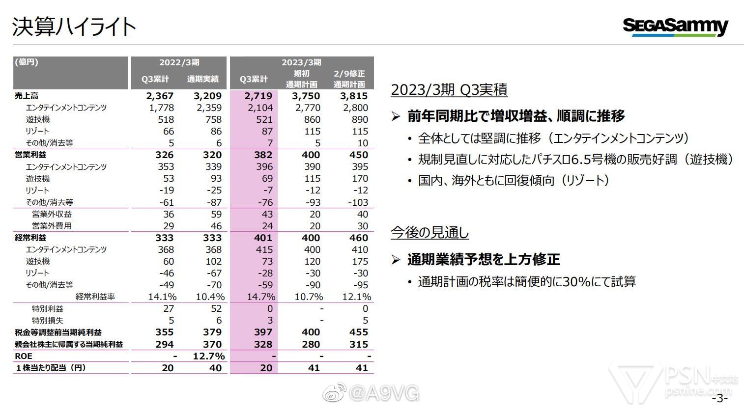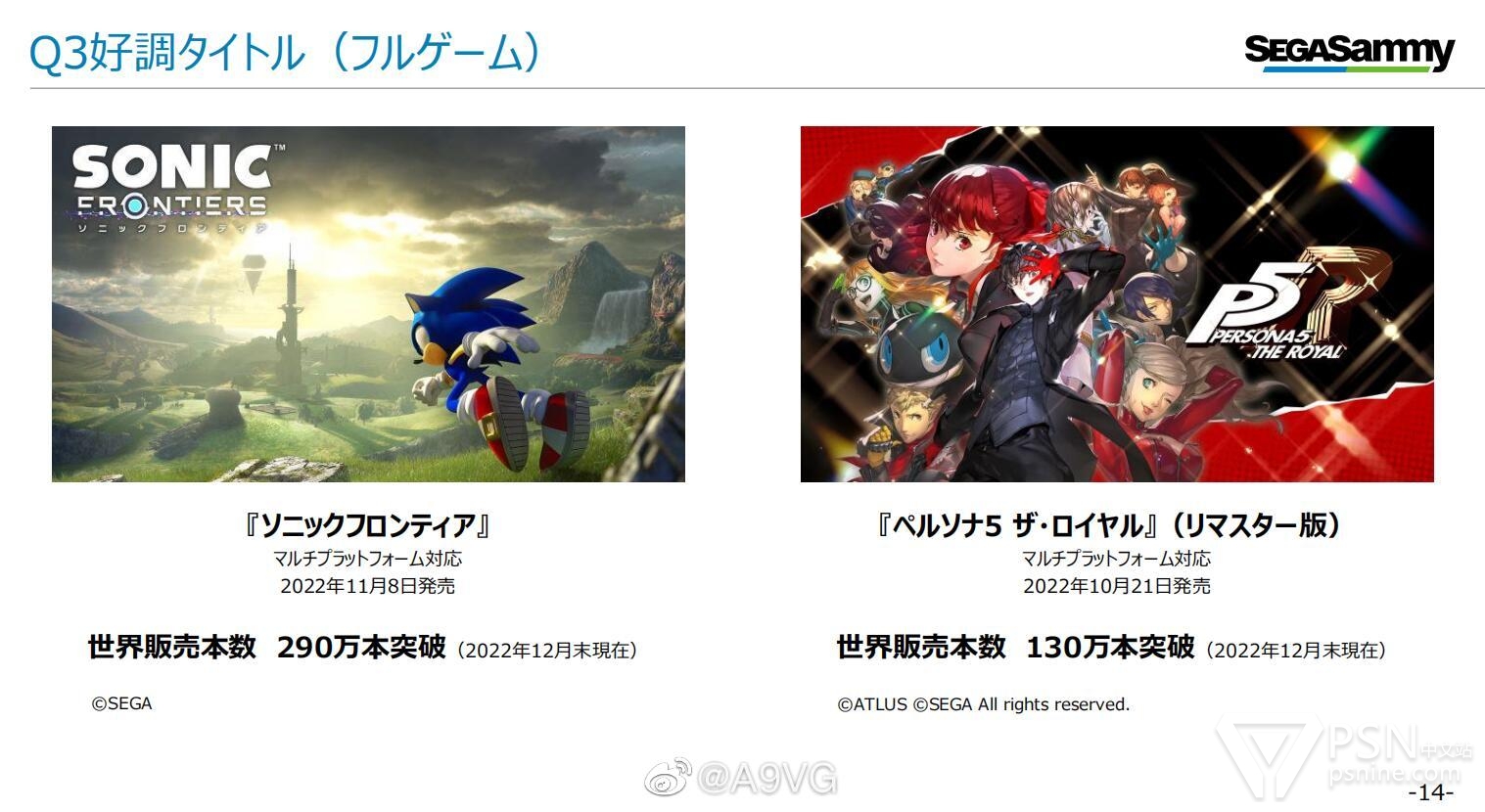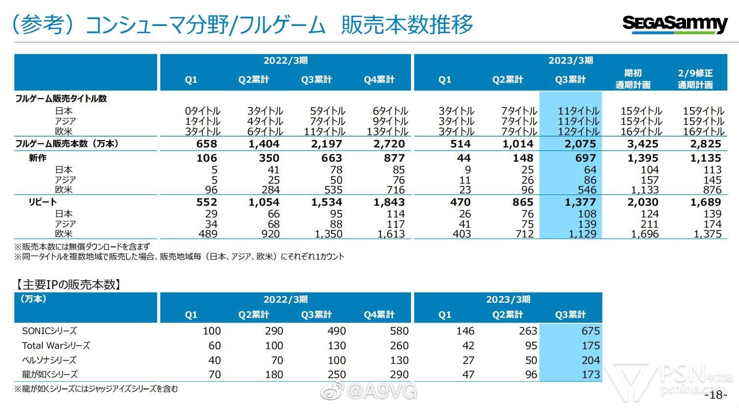 其中以家用游戏为中心的娱乐内容业务方面,包括F2P内容在内,整体平稳推移,销售势头良好。Q3主要发售的新作包括《索尼克 未知边境》、《女神异闻录5 皇家版》复刻移植版、《足球经理2023》等,主机游戏整体销量为2075万份(上一财年同期为2197万份,稍有下滑)。