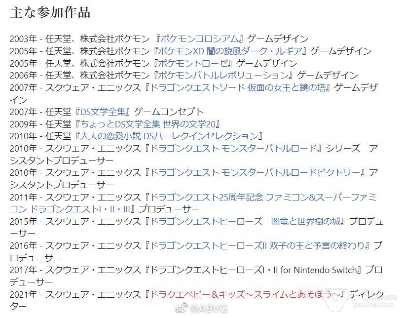 主要负责过的作品:《勇者斗恶龙25周年纪念 FC&SFC DQ123》《勇者斗恶龙英雄集结 暗龙与世界树之城》《勇者斗恶龙 英雄集结2》