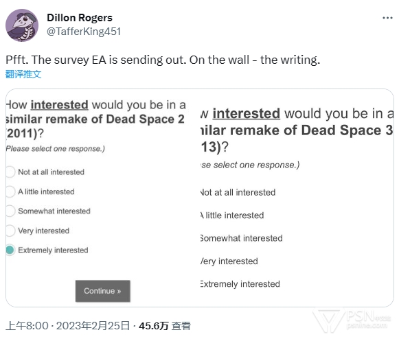 独立游戏《Gloomwood》《Dusk》的开发者Dillon Rogers在其个人推特上晒出了两张来自EA、关于《死亡空间》系列的调查问卷的截图。