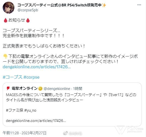 (图1)《屍体派对》官方推特:“屍体派对系列完全新作正在锐意制作中。”