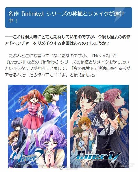 (图2)MAGES.的游戏事业本部部长浅田诚接受媒体采访时还表示:“名作《infinity》系列(《Never7》《Ever17》等)的移植与重制已在进行之中。”