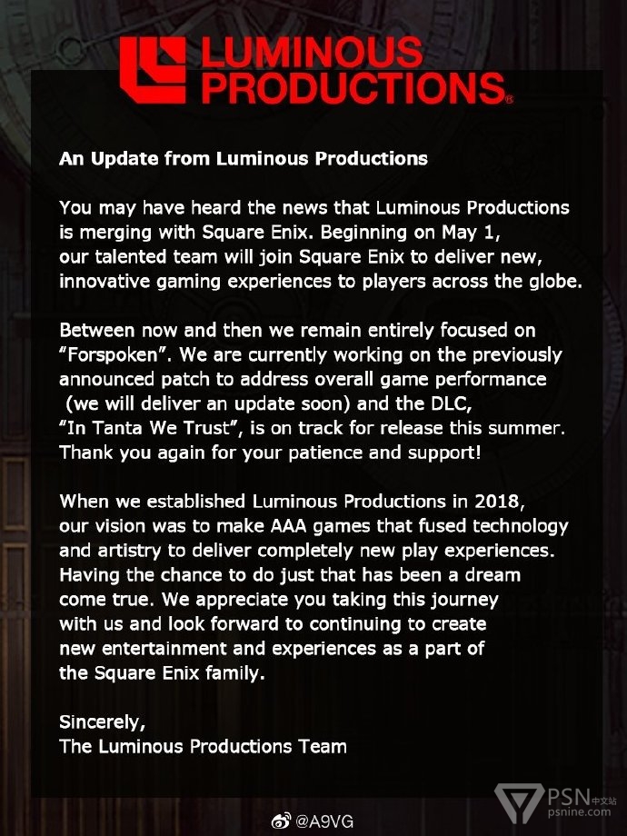 Square Enix宣布,《ForSpoken》开发工作室Luminous Productions(夜光组)将于5月1日并入SE本社,不再作为独立的全资子公司存在。SE表示此次合并是为了加强集团开发工作室的竞争能力所做的一部分,也是公司业务战略中提到的目标。合并完成后,夜光组之前在3A级游戏与游戏引擎方面的经验将进一步加强SE集团开发高清游戏的能力。