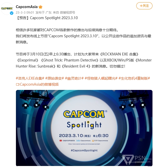 Capcom Spotlight将于北京时间2023年3月10日6:30播出,届时会带来《洛克人EXE合集》《Exoprimal》《幽灵诡计》《怪物猎人:崛起-曙光》《生化危机4》的新消息。
