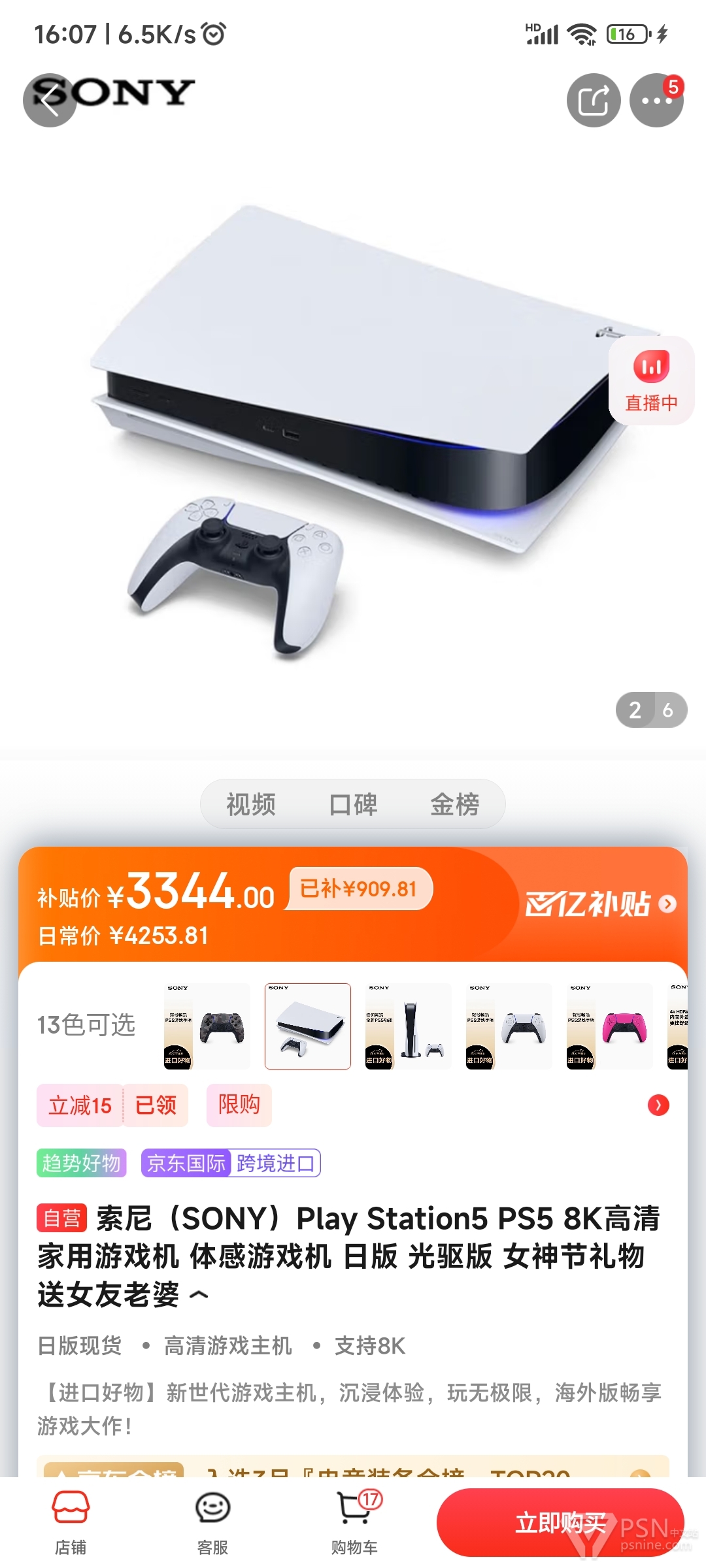 京东百亿补贴今日开始 ps5日版自营3344 可以下手了