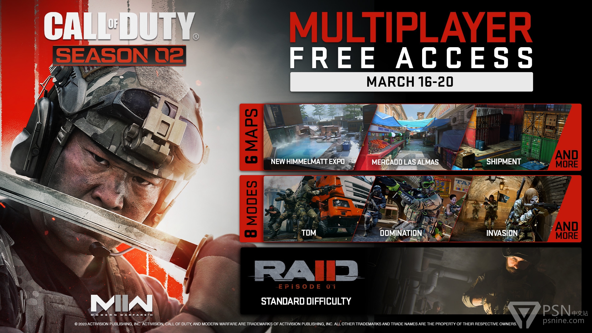 《使命召唤:现代战争2》将于北京时间2023年3月17日1:00-3月21日1:00开展免费游玩活动,在此期间玩家可免费体验本作的多人模式及特种行动。