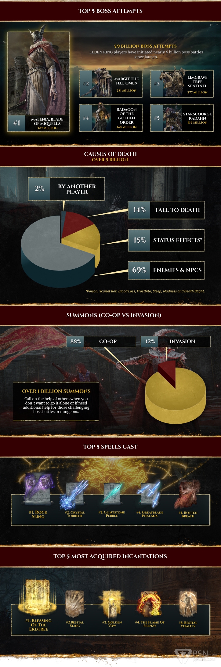 ·玩家共挑战Boss 59亿次,排名前5的分别是:玛莲妮亚(3.29亿次)、恶兆妖鬼 玛尔基特(2.81亿次)、大树守卫(2.77亿次)、拉达冈(1.48亿次)、碎星(1.39亿次)