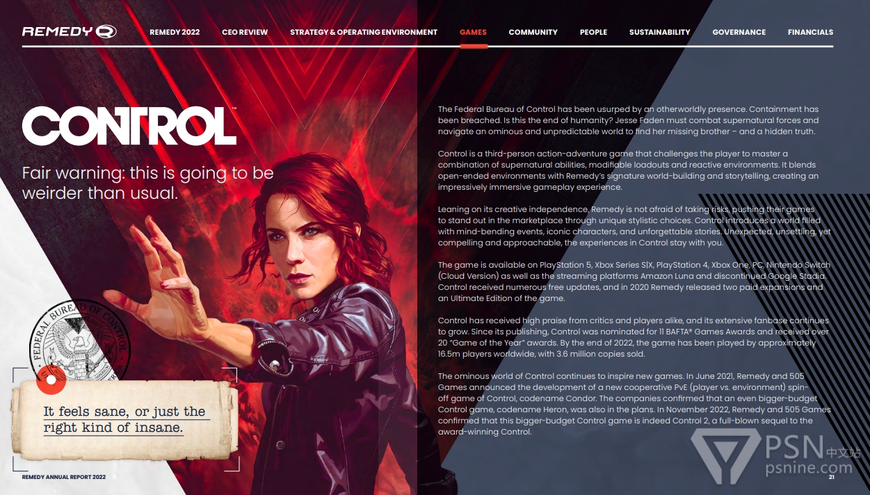 截止至2022年底,《控制》销量已达360万份、约有1650万玩家游玩过本作