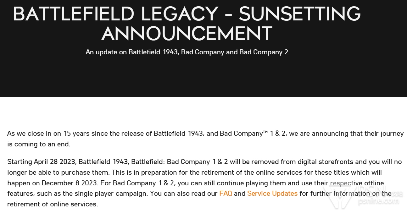 《战地1943》《战地:叛逆连队》《战地:叛逆连队2》将于2023年4月28日从各平台商店下架,并将于2023年12月8日关闭在线服务。